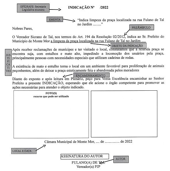 Para ilustrar a indicação, poderá o vereador incluir fotos com legenda antes da data e local ou em anexo, com citação da existência do anexo no corpo da indicação.